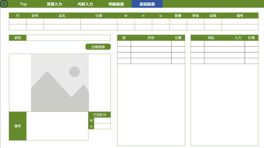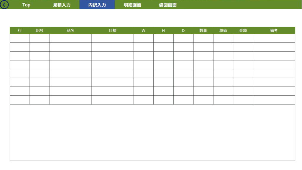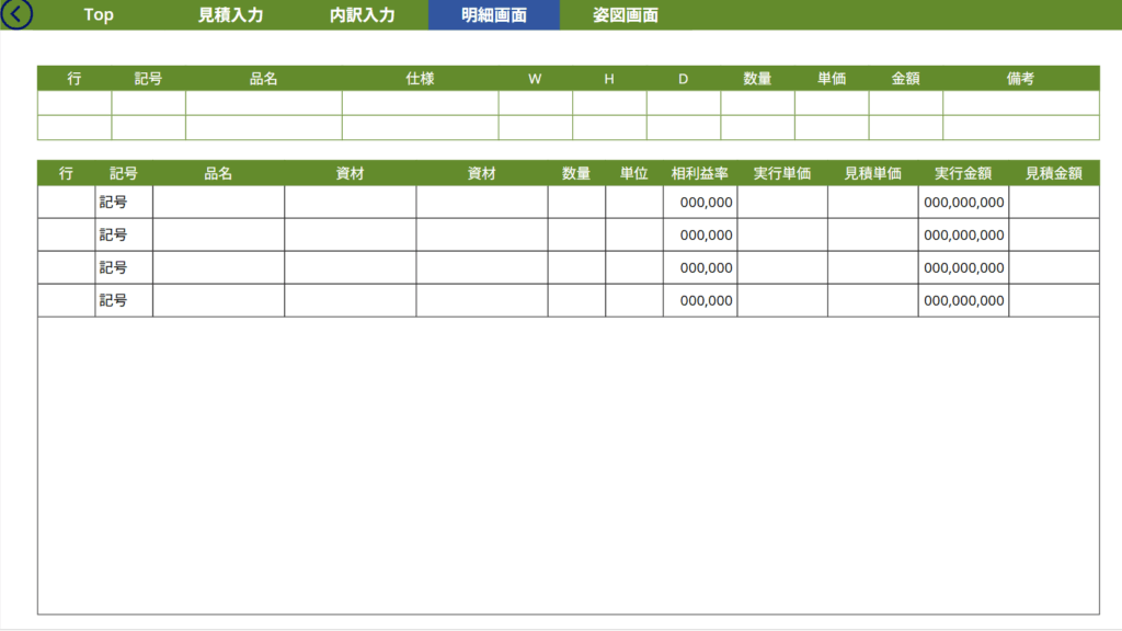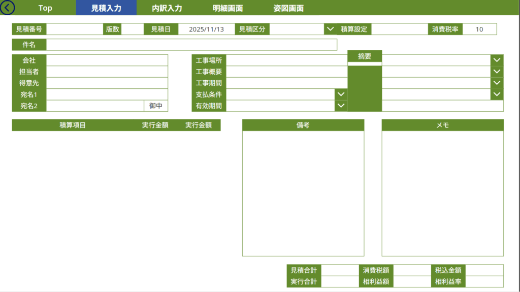 • 「見積入力」「内訳入力」「明細画面」などの画面に分かれており、入力作業がステップごとに整理されている。