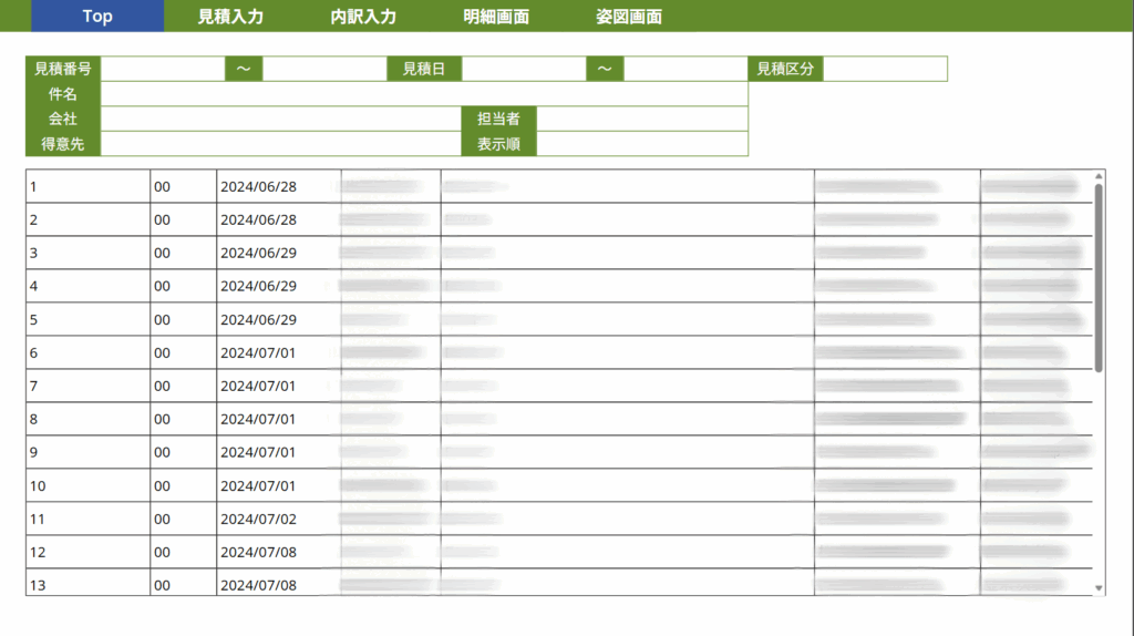 - 「見積入力」「内訳入力」「明細画面」などの画面に分かれており、入力作業がステップごとに整理されている。