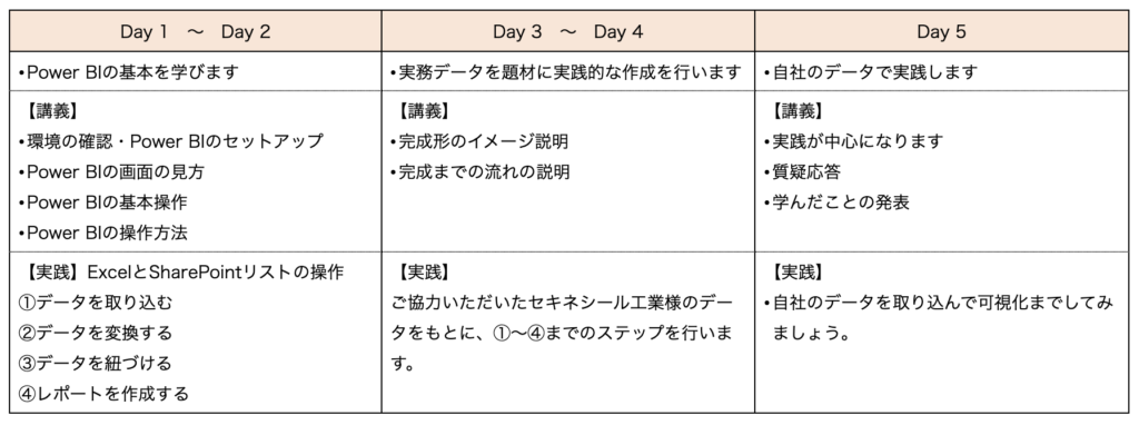 本研修を通じ、Microsoft365の製品を活用し、現場でのデジタル化、生産性の向上につながるイメージを持っていただきました。Power BIによるデータの可視化・分析の基本を学び、自社のデータを用いたデータ分析を実践していただきました。